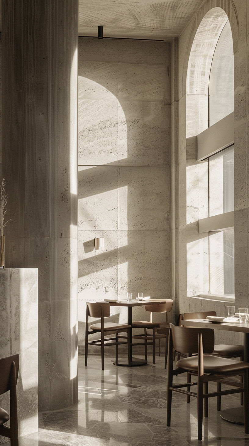 A modern, minimalistic café inspired by nature, utilizing natural materials and maximizing the use of natural light. In this design, the aim was to create a cozy and inviting atmosphere, with comfortable spaces nestled among arches and beams, providing a pleasant environment for those sitting in the café. The thoughtful integration of natural elements and light creates a serene and harmonious setting, perfect for relaxation and enjoyment.