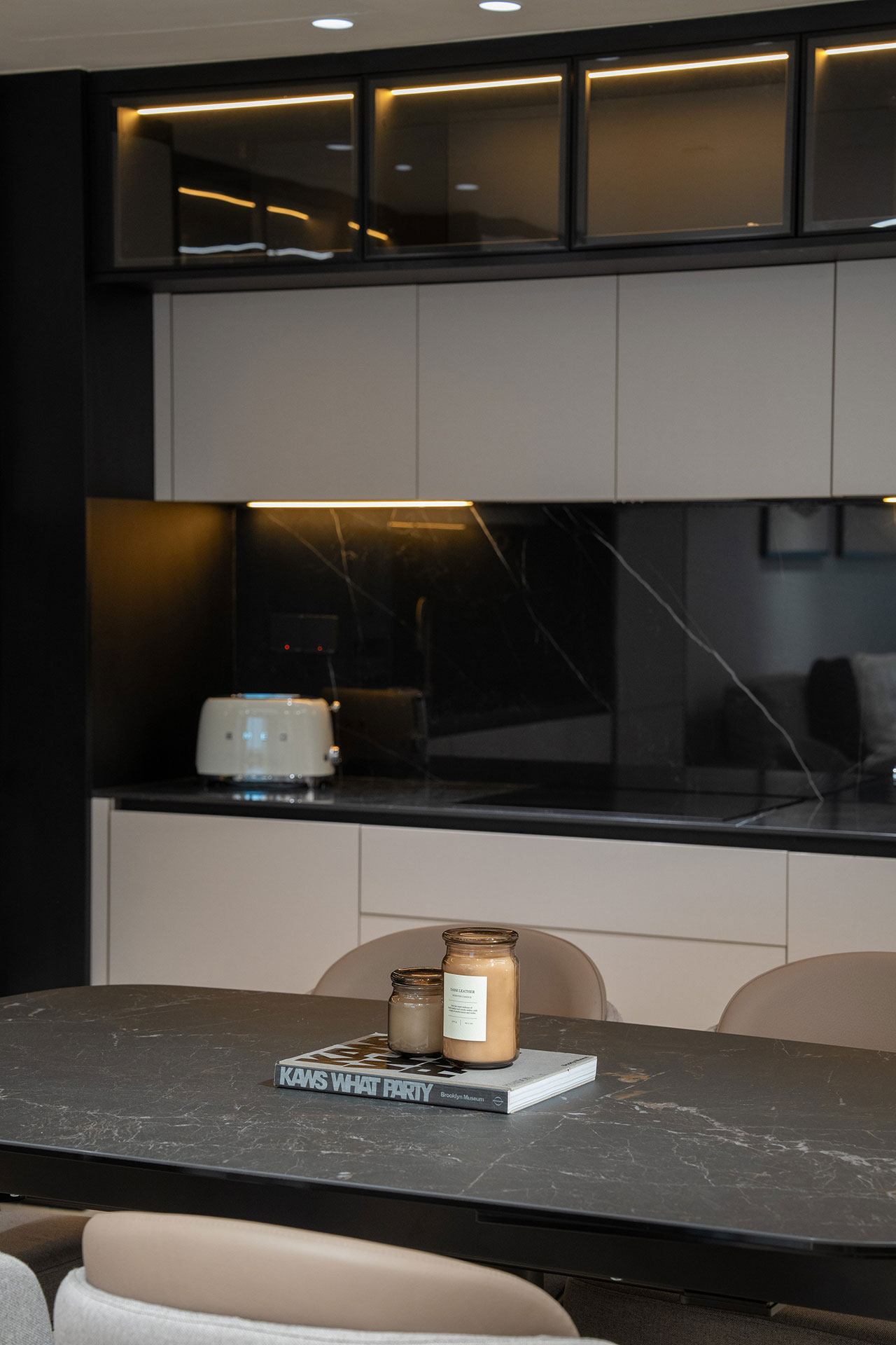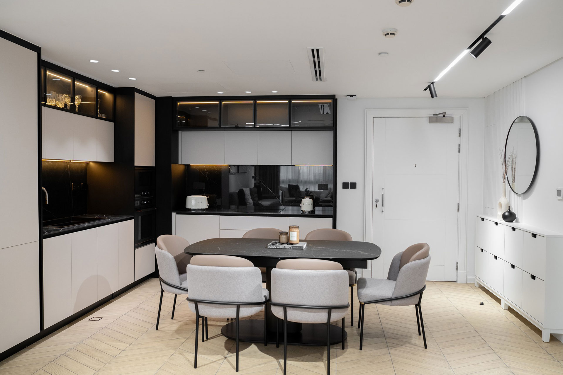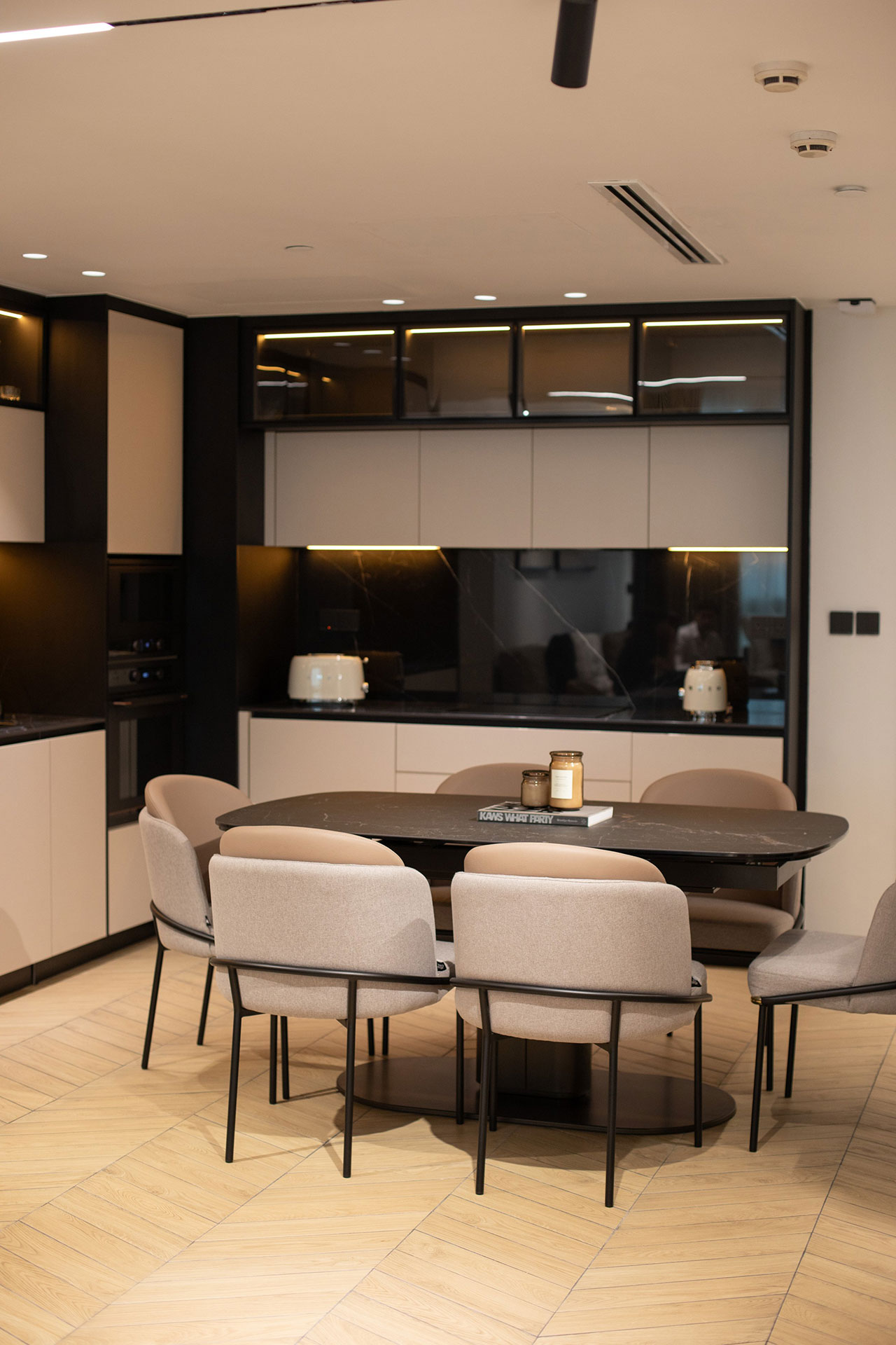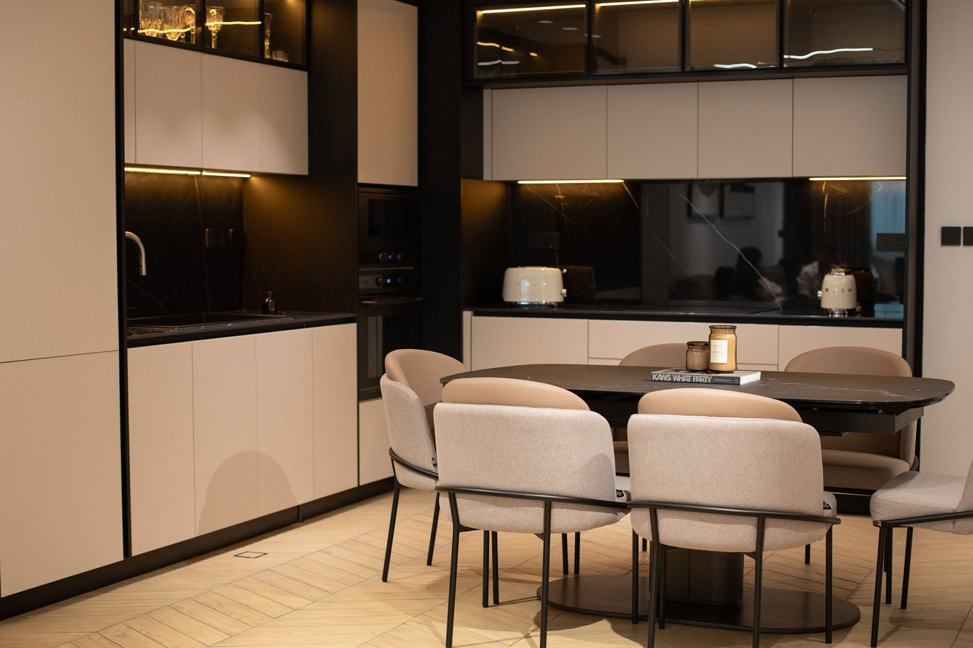 A comprehensive kitchen service that offers a modern design blending beige tones with dark accents. Despite its compact size, the kitchen is thoughtfully designed to maximize space and functionality. The layout includes an integrated dining area, making the space not only practical but also inviting for both cooking and dining.