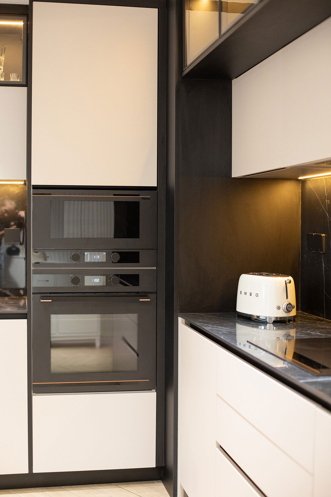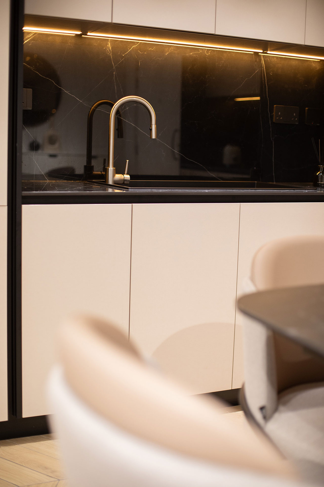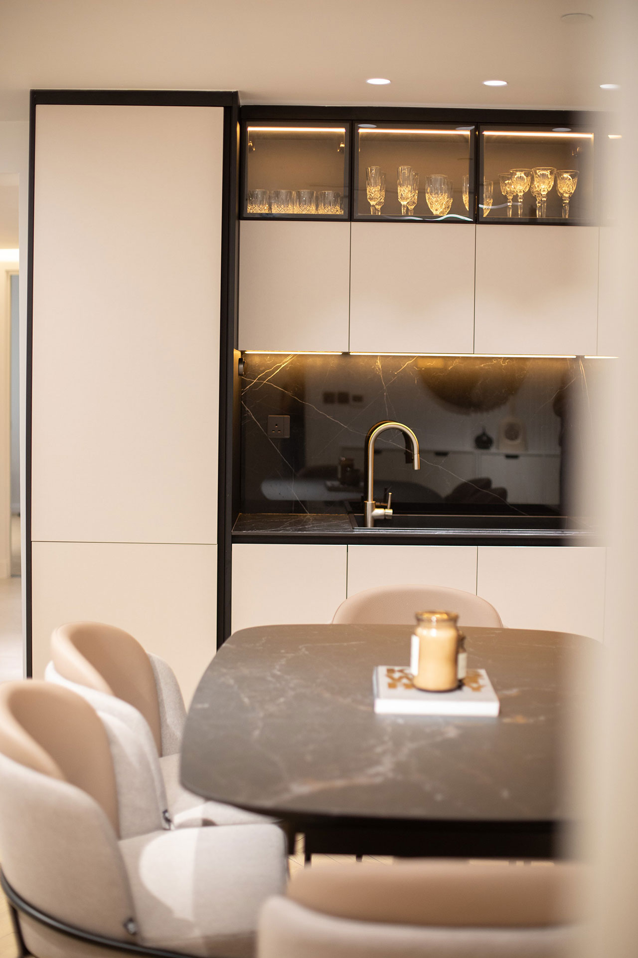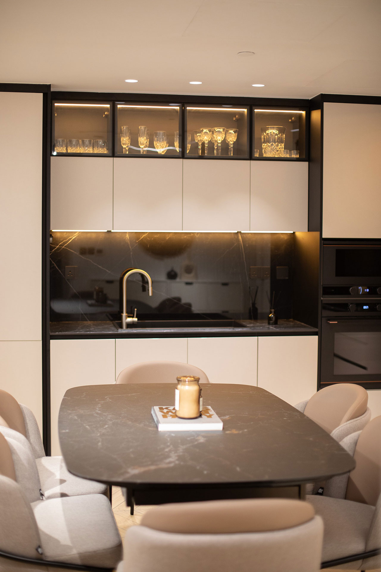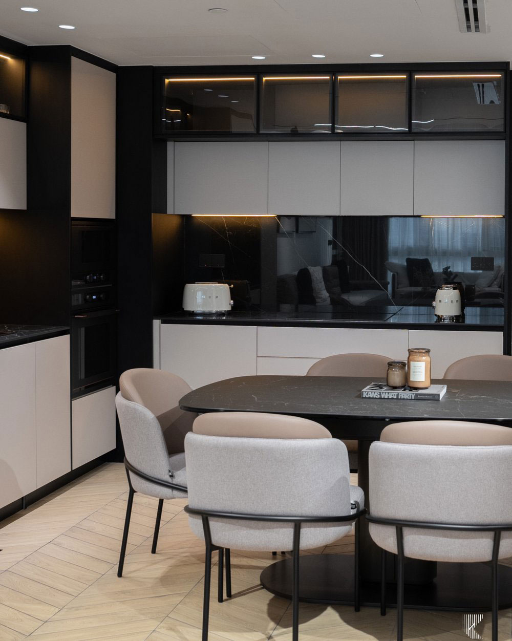 A comprehensive kitchen service that offers a modern design blending beige tones with dark accents. Despite its compact size, the kitchen is thoughtfully designed to maximize space and functionality. The layout includes an integrated dining area, making the space not only practical but also inviting for both cooking and dining.