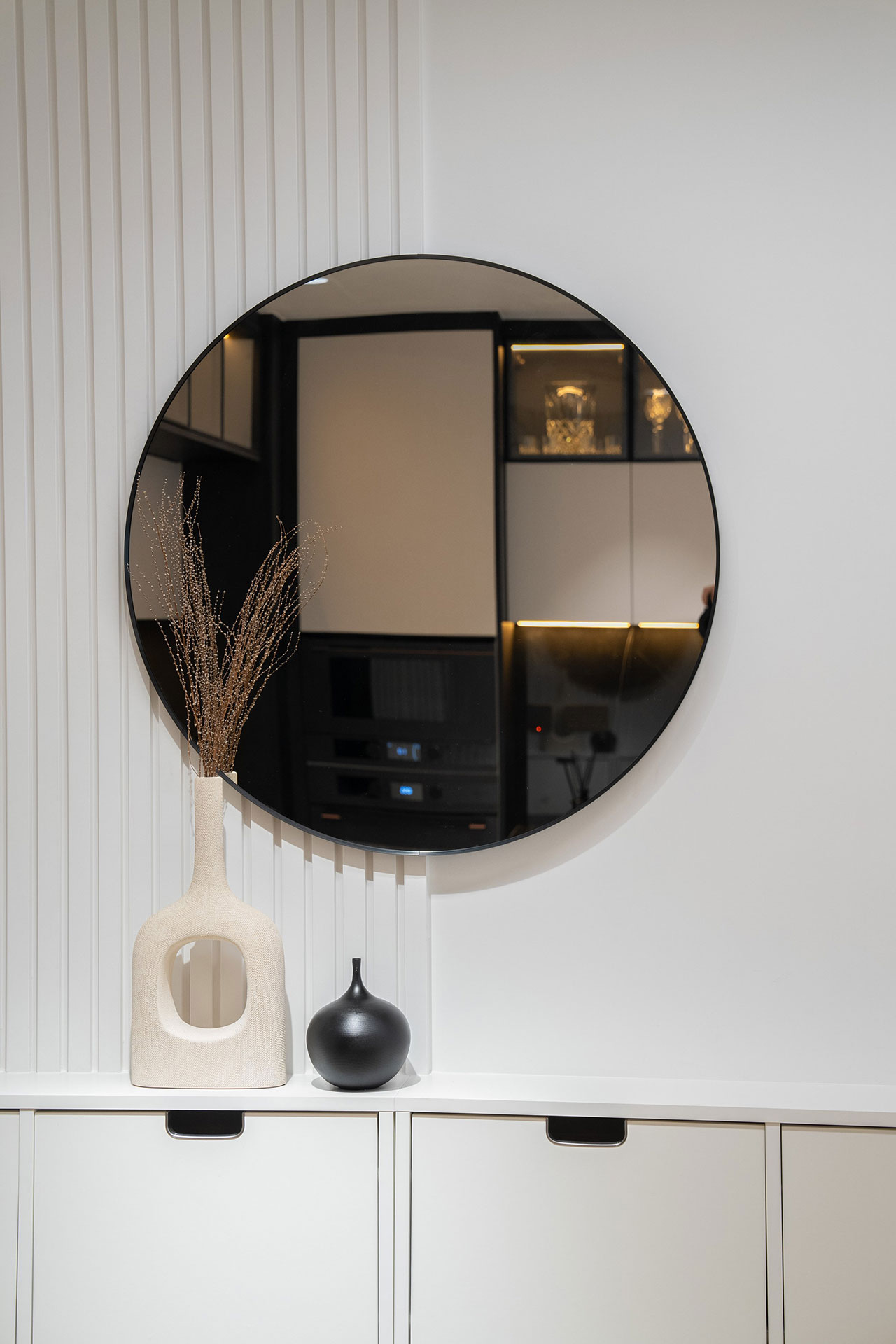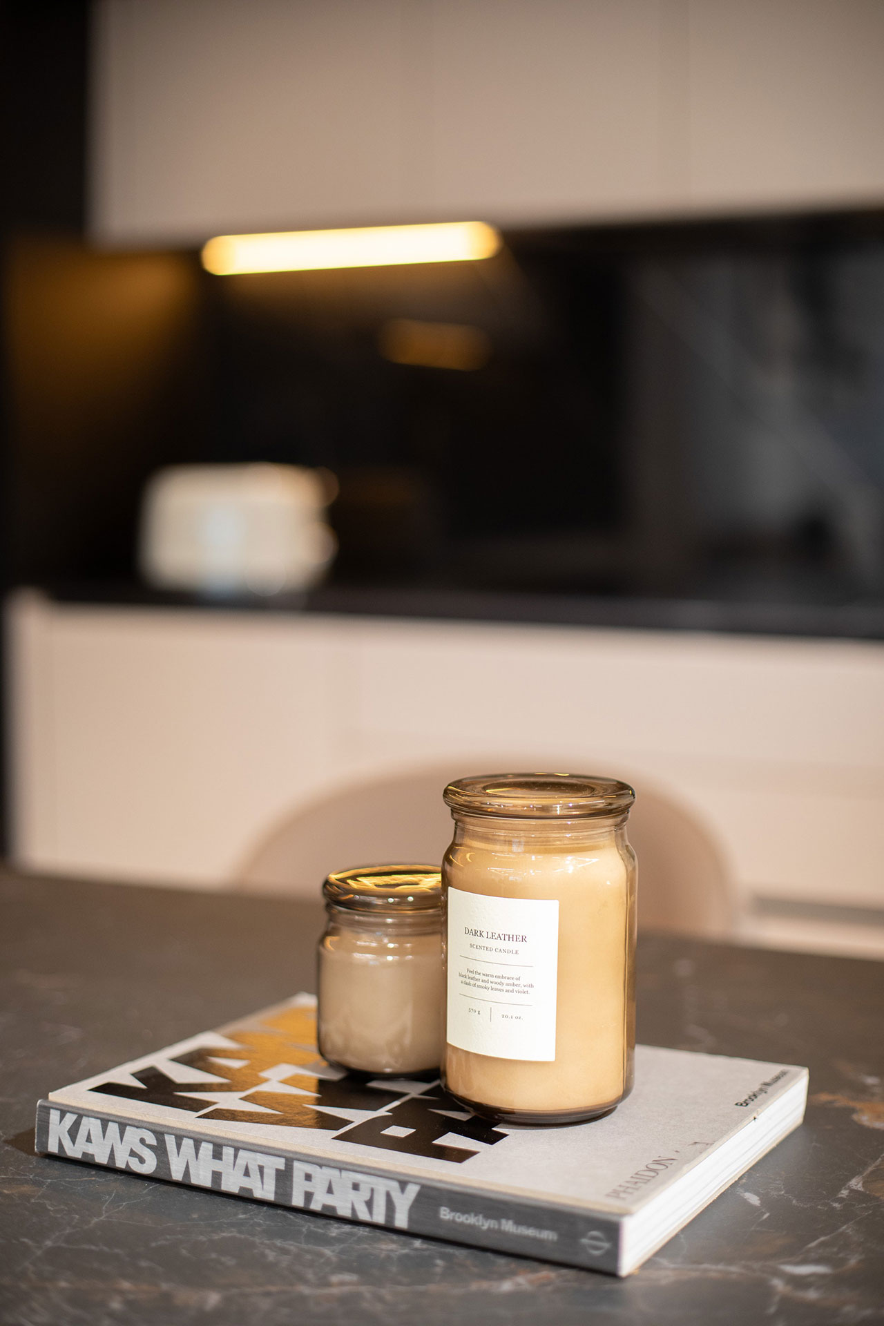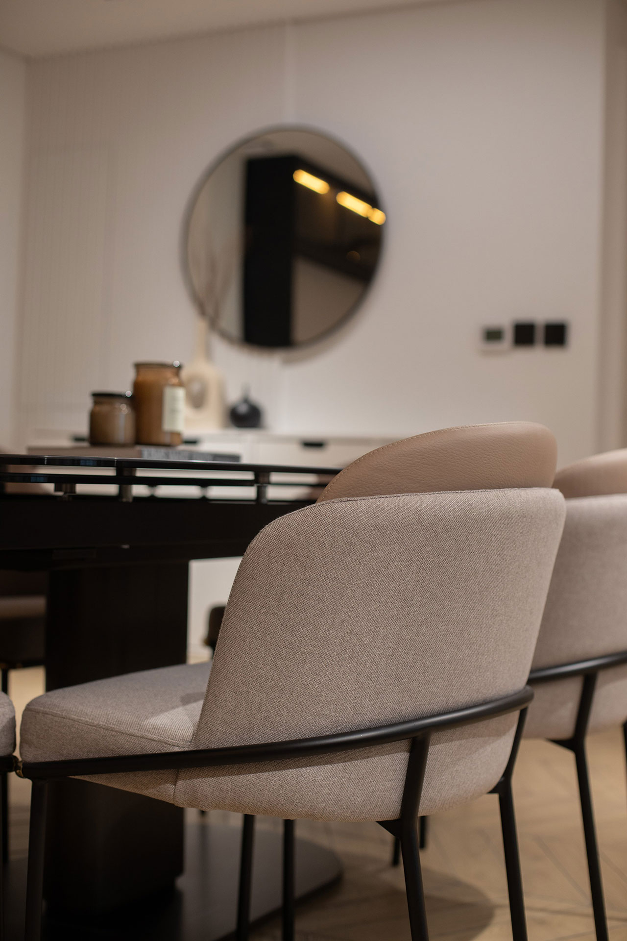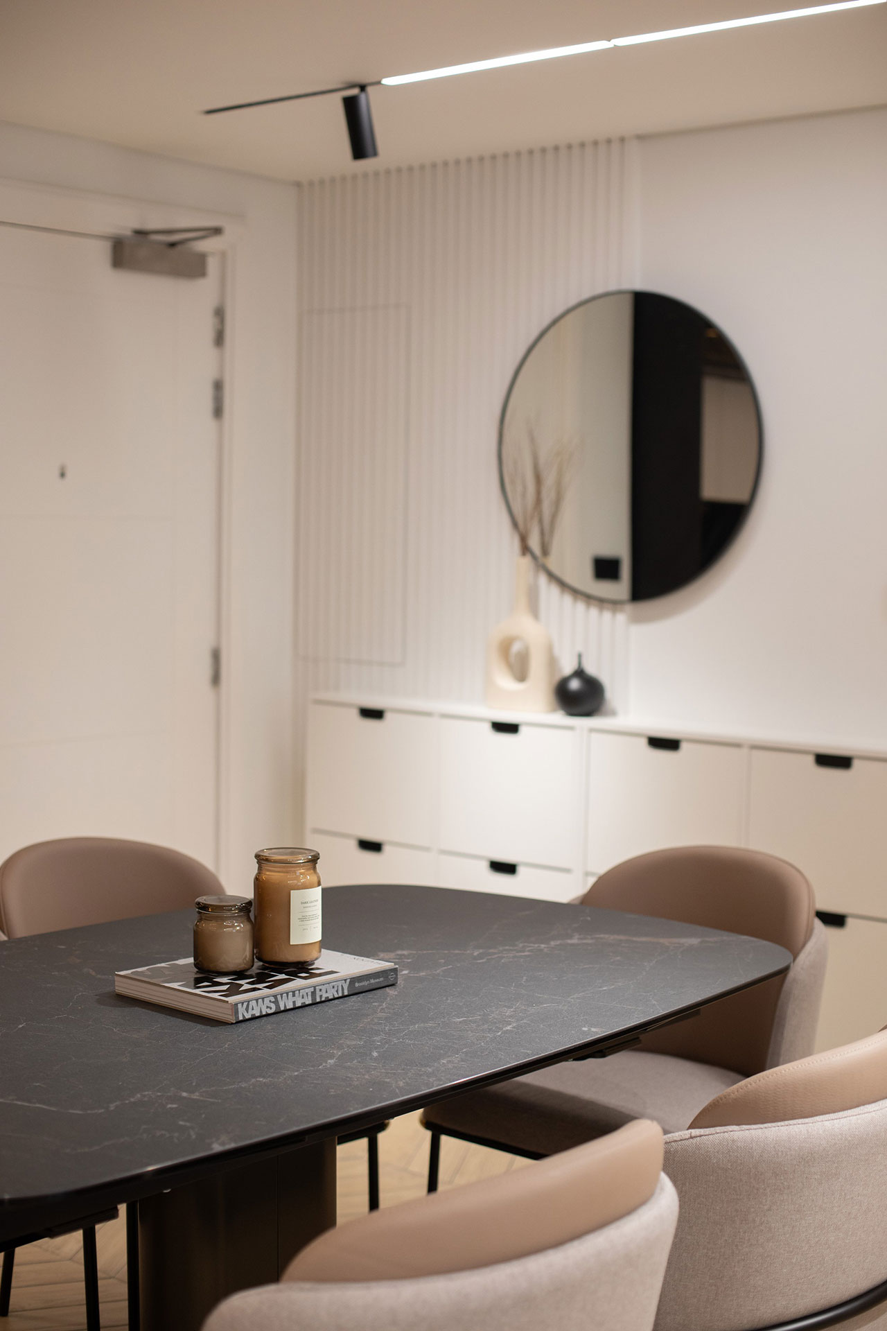 A comprehensive kitchen service that offers a modern design blending beige tones with dark accents. Despite its compact size, the kitchen is thoughtfully designed to maximize space and functionality. The layout includes an integrated dining area, making the space not only practical but also inviting for both cooking and dining.